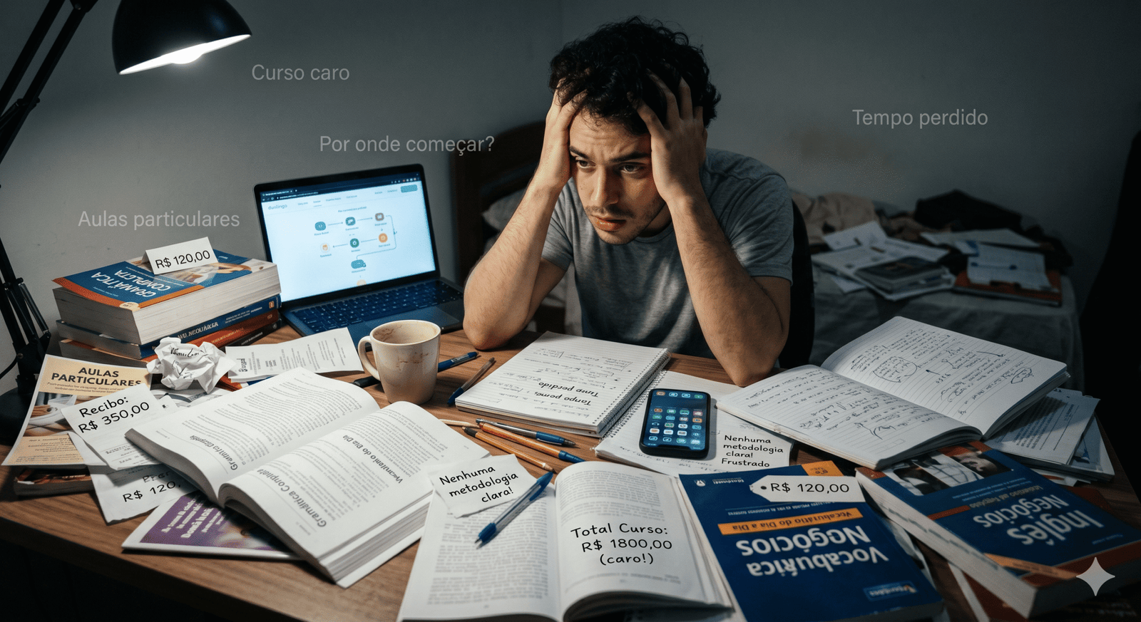 Adultos inteligentes e disciplinados travados no inglês, não por incapacidade, mas porque tentavam aprender como se aprende matemática: acumulando regra, decorando lista e traduzindo palavra por palavra.