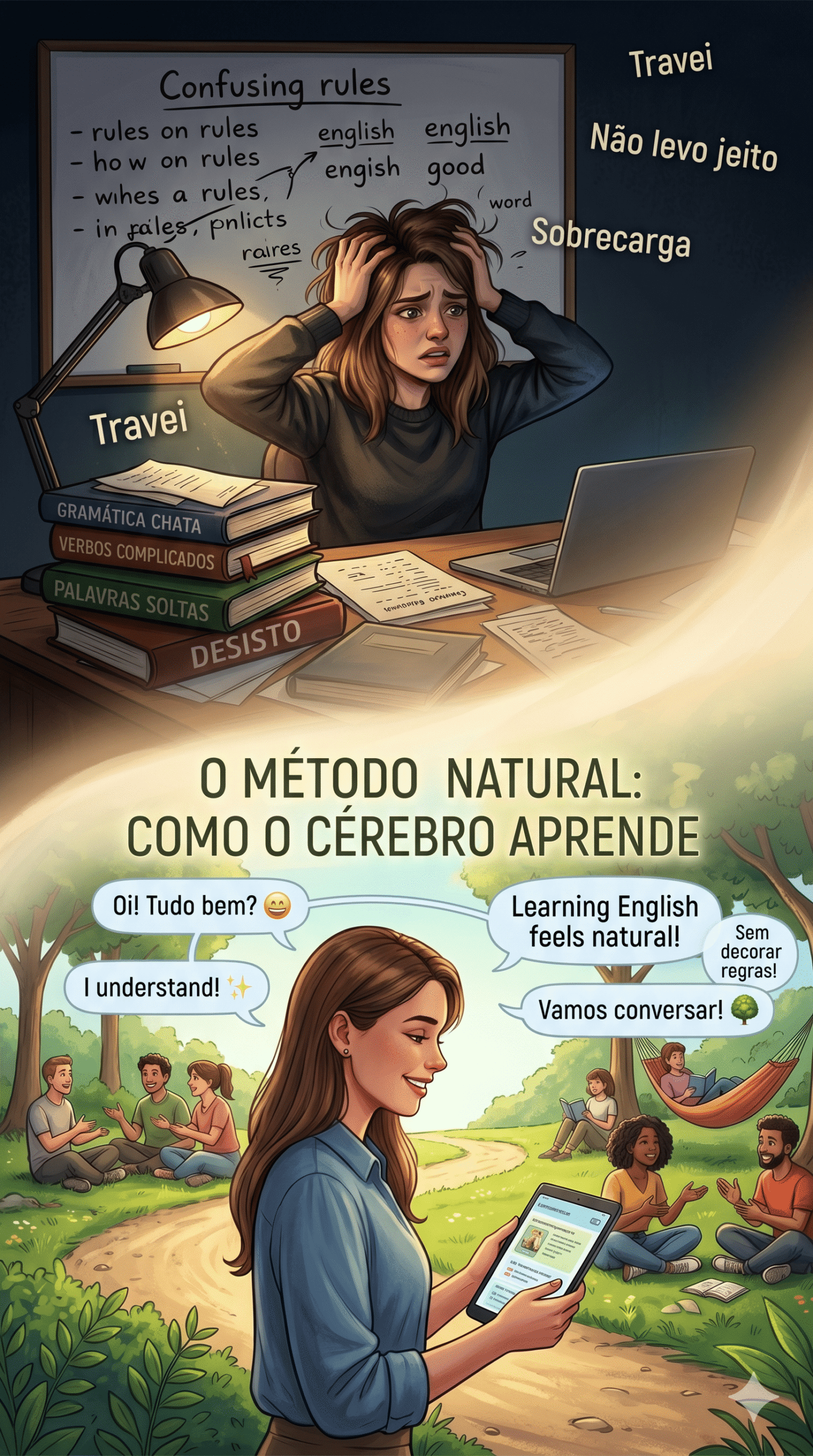 Muito ensino tradicional ativa a memória de regras (o “saber sobre” a língua). Mas para entender e falar com naturalidade, você precisa construir processamento automático — aquilo que o cérebro faz sem esforço consciente.
