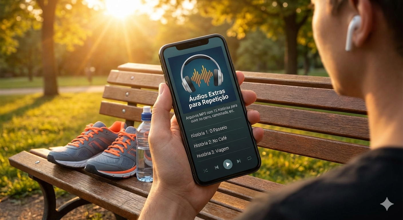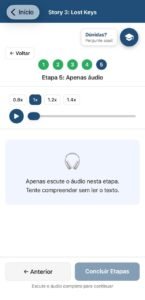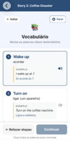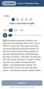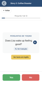 Aqui você testa sua compreensão dentro do contexto da história, fortalecendo a capacidade de entender frases completas sem depender de explicações longas.